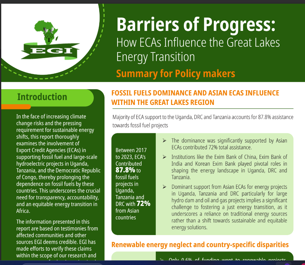 In the face of increasing climate change risks and the pressing requirement for sustainable energy shifts, this report thoroughly examines the involvement of Export Credit Agencies (ECAs) in supporting fossil fuel and large-scale hydroelectric projects in Uganda, Tanzania, and the Democratic Republic of Congo, thereby prolonging the dependence on fossil fuels by these countries. This underscores the crucial need for transparency, accountability, and an equitable energy transition in Africa.